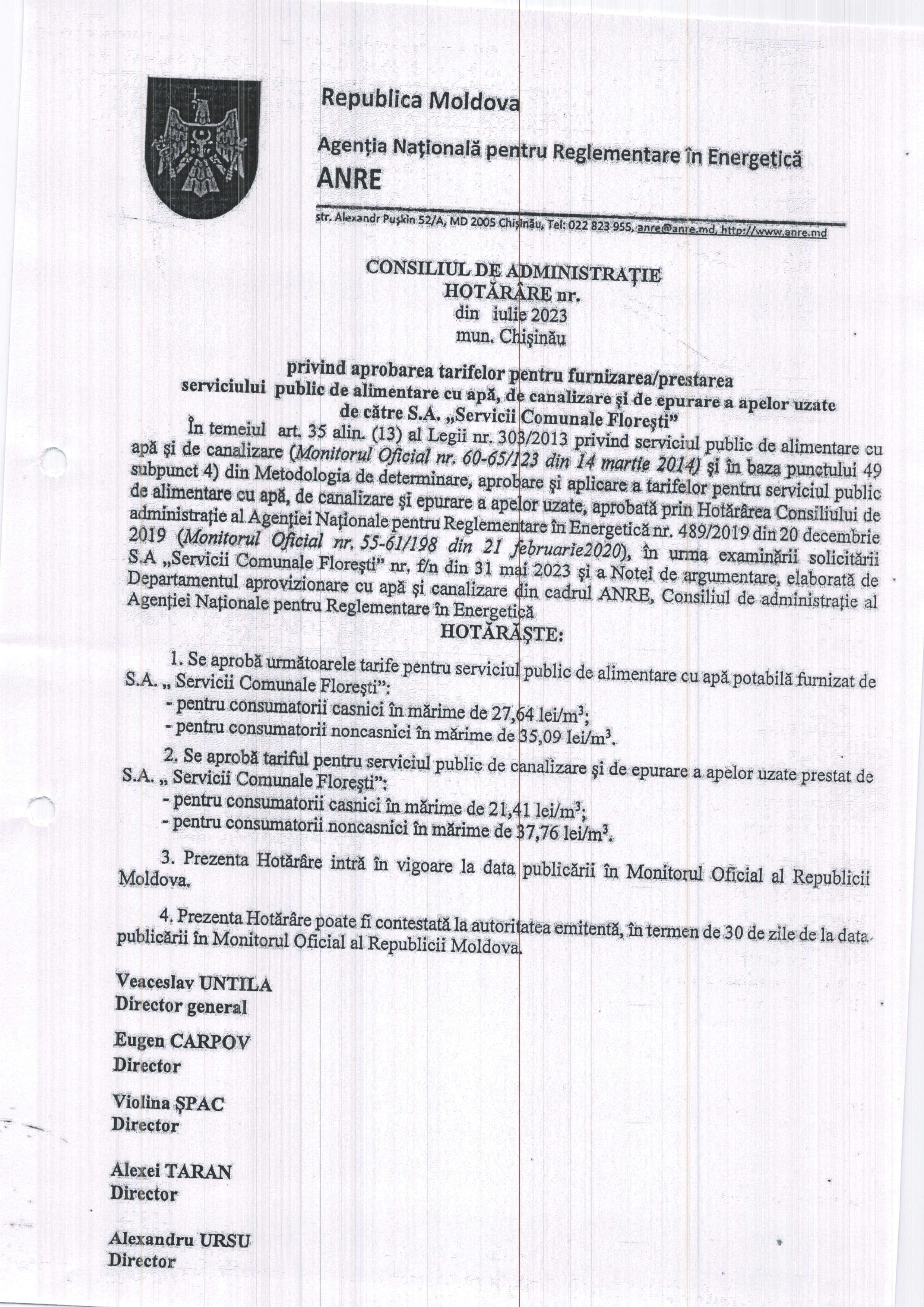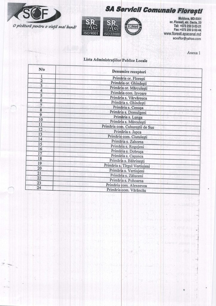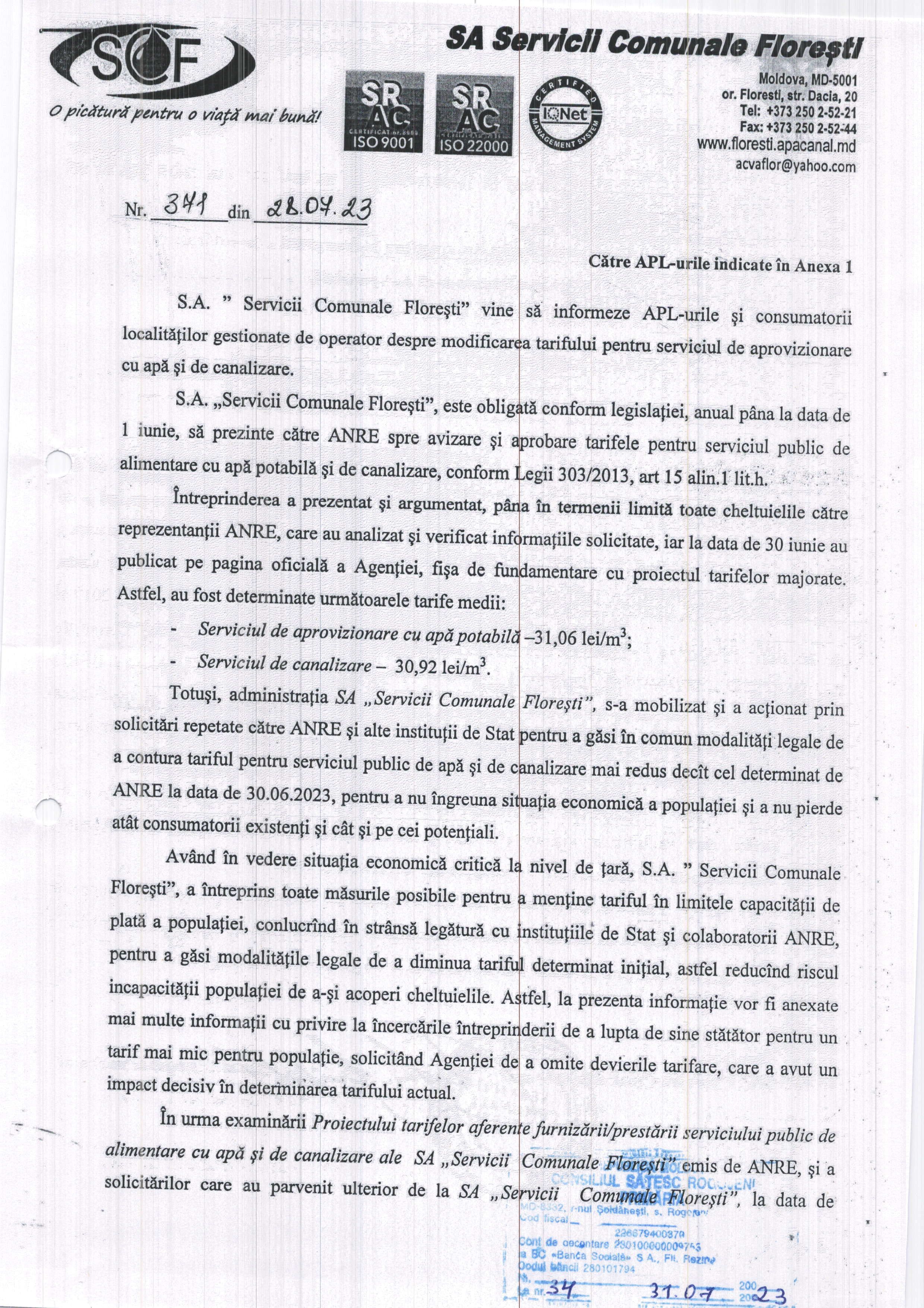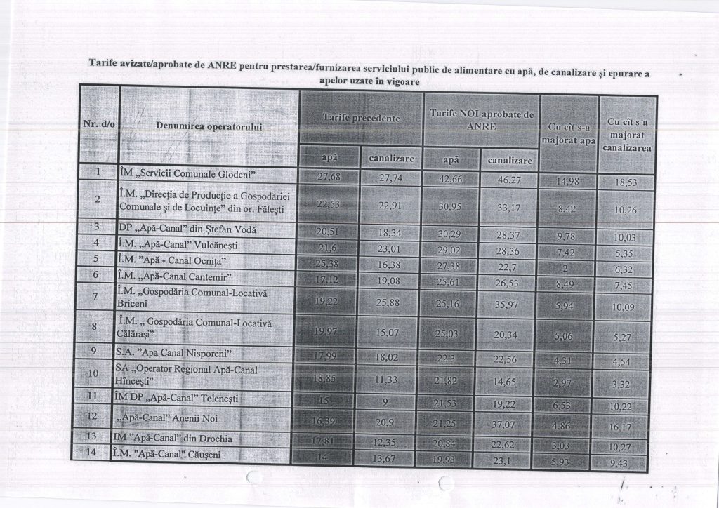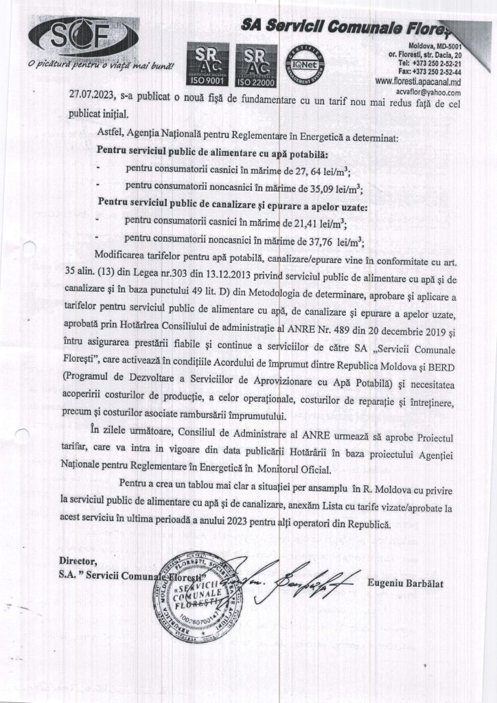 Anunț privind modificarea tarifului pentru serviciul de aprovizionare cu apă și canalizare
